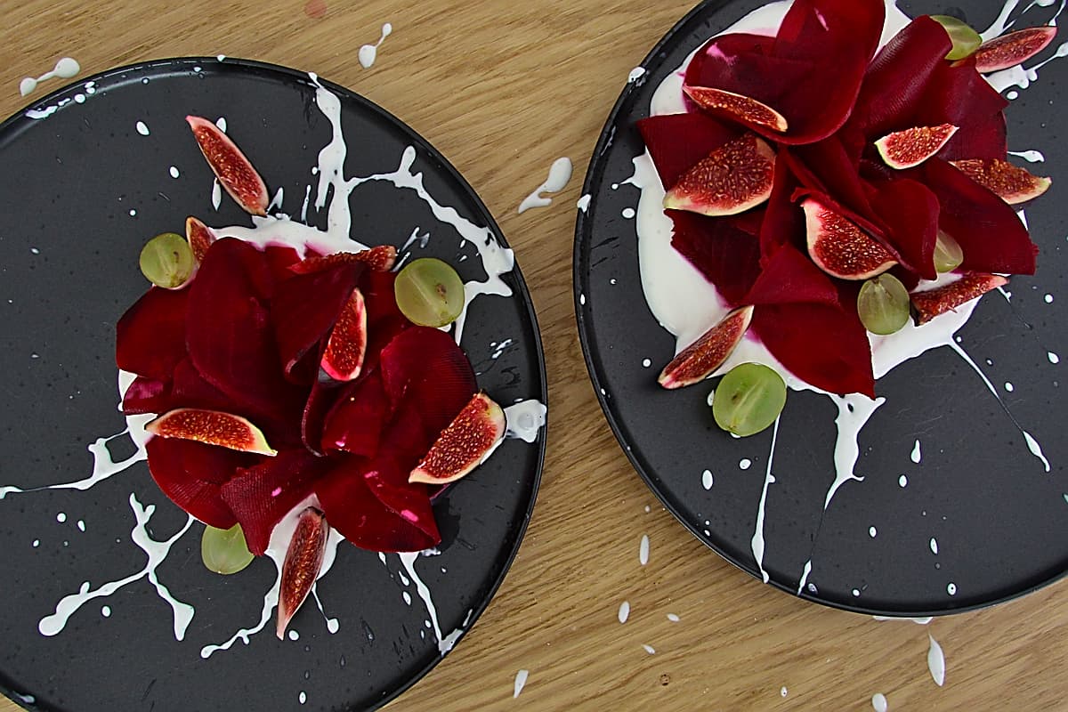 - Dressez l’assiette en commençant par étaler une couche de crème de chèvre, puis en déposant les rondelles de betterave en les “chiffonnant légèrement”. Terminez en déposant des petites touches de pesto de roquette.
